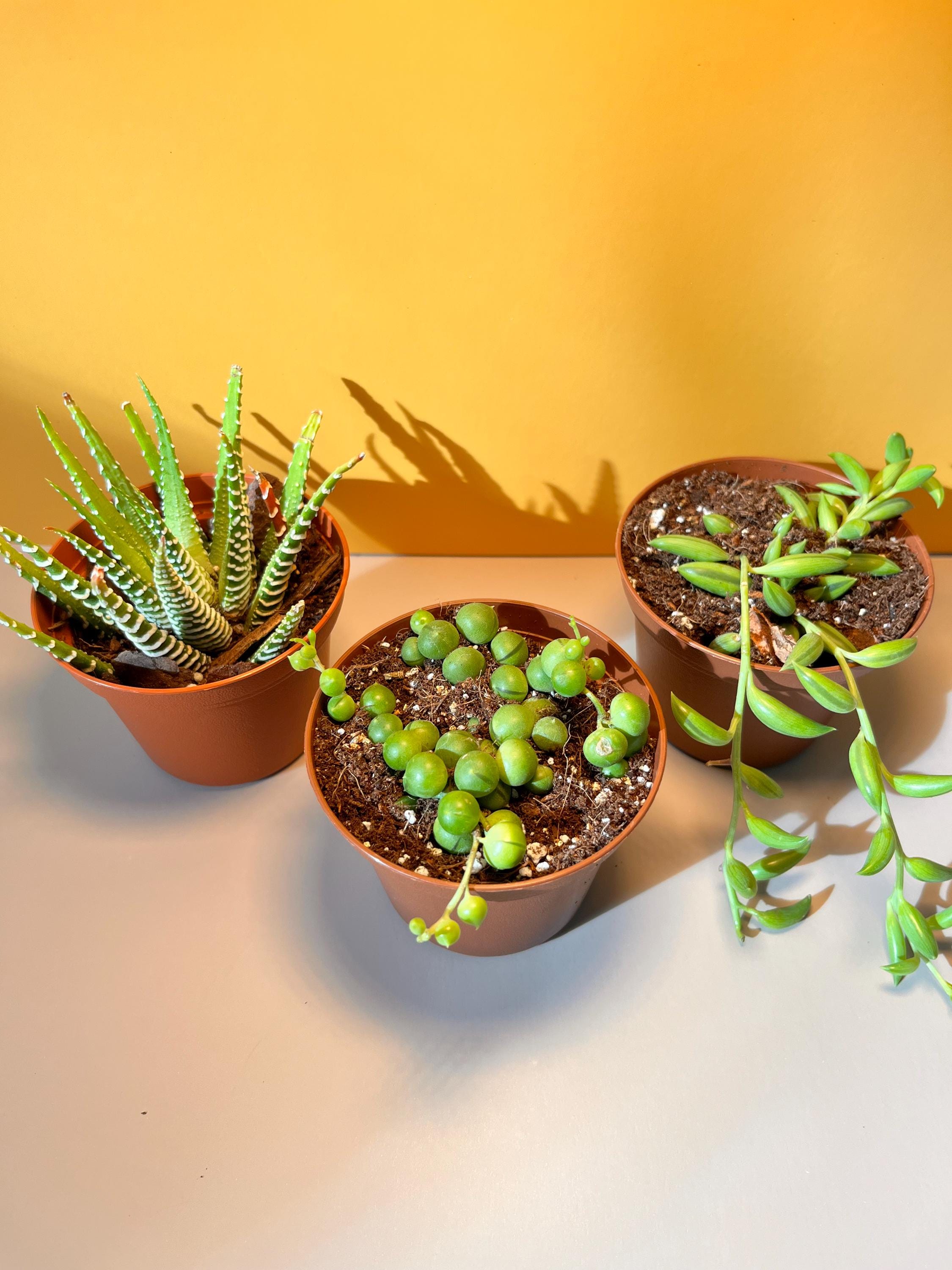 The String of Bananas is a unique, trailing succulent known for its fun, banana-shaped leaves and fast-growing vines. It’s the perfect plant for hanging pots or shelves and makes a great gift for any plant lover. With the right care, it will reward you with long, cascading trails of greenery.