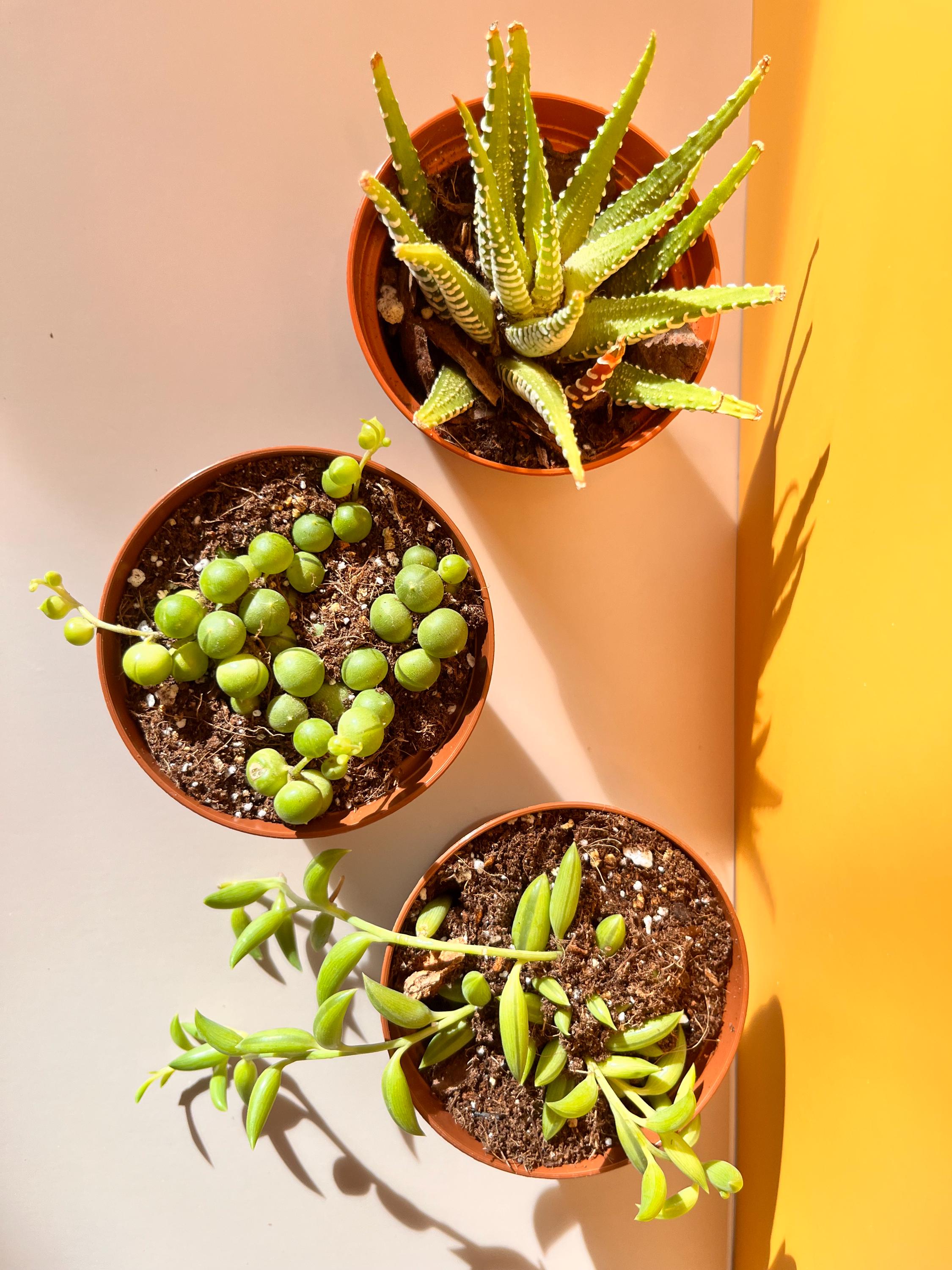 Allow the soil to dry out completely between waterings. Water sparingly — overwatering is the most common mistake with succulents. Make sure your pot and soil have excellent drainage.