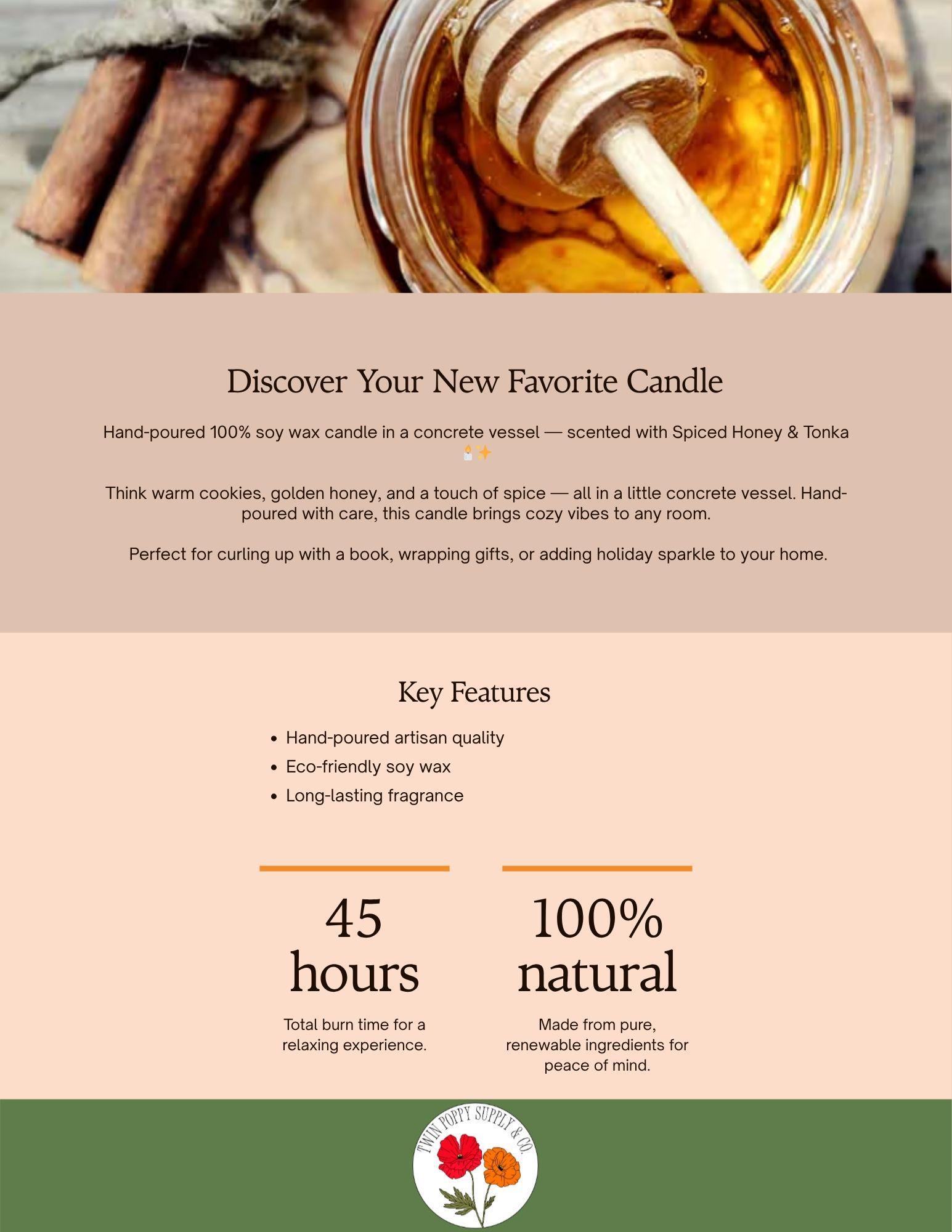 Think warm cookies, golden honey, and a touch of spice — all in a little concrete vessel. Hand-poured with care, this candle brings cozy vibes (and a hint of magic) to any room. Perfect for curling up with a book, wrapping gifts, or adding holiday sparkle to your home.