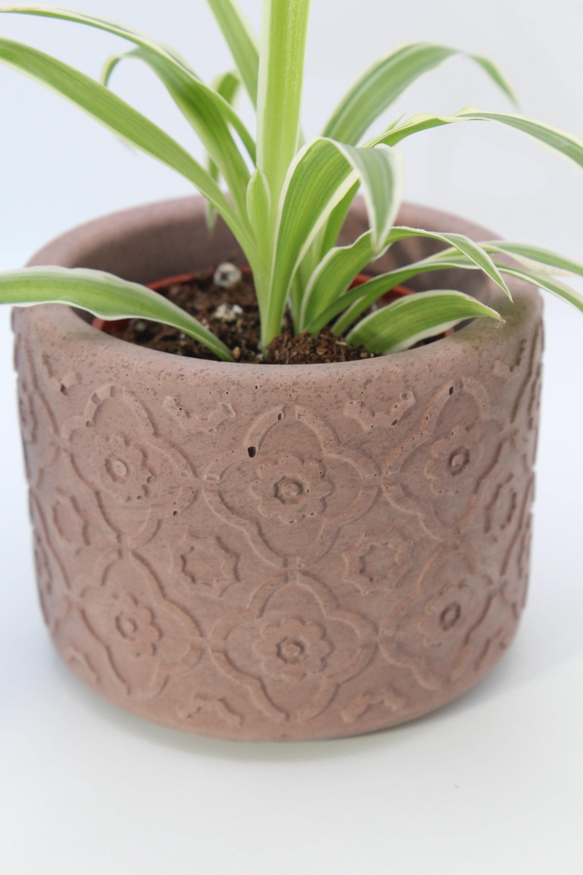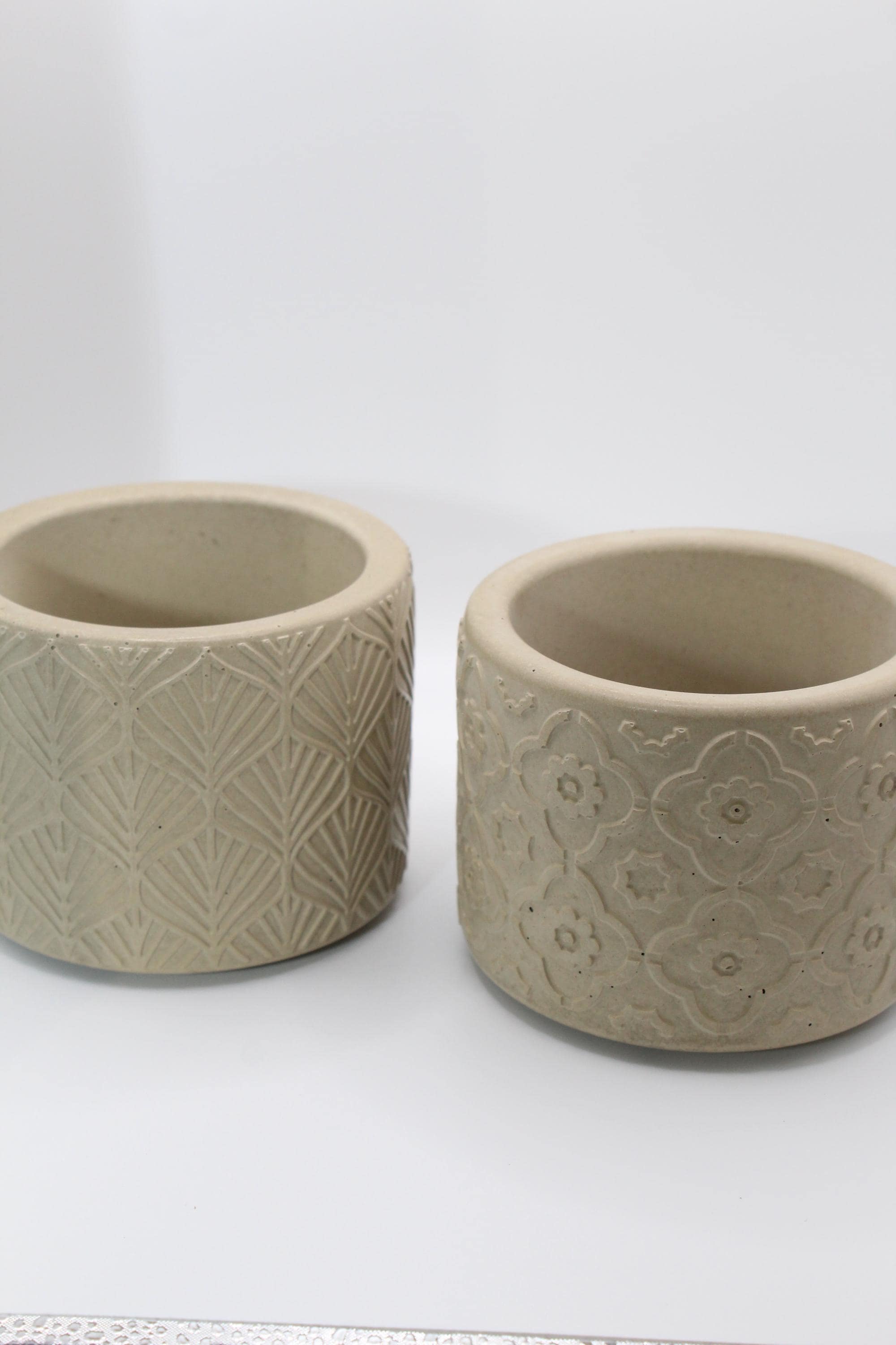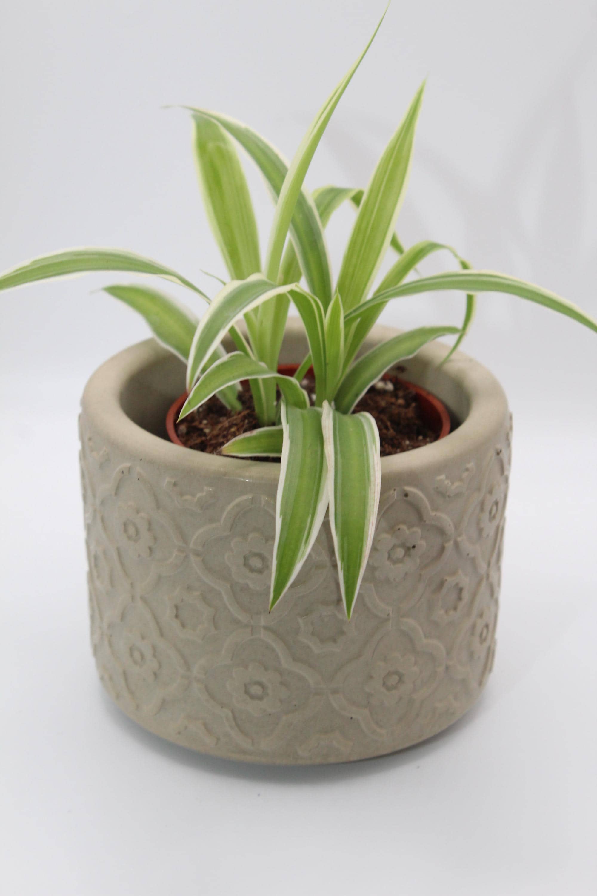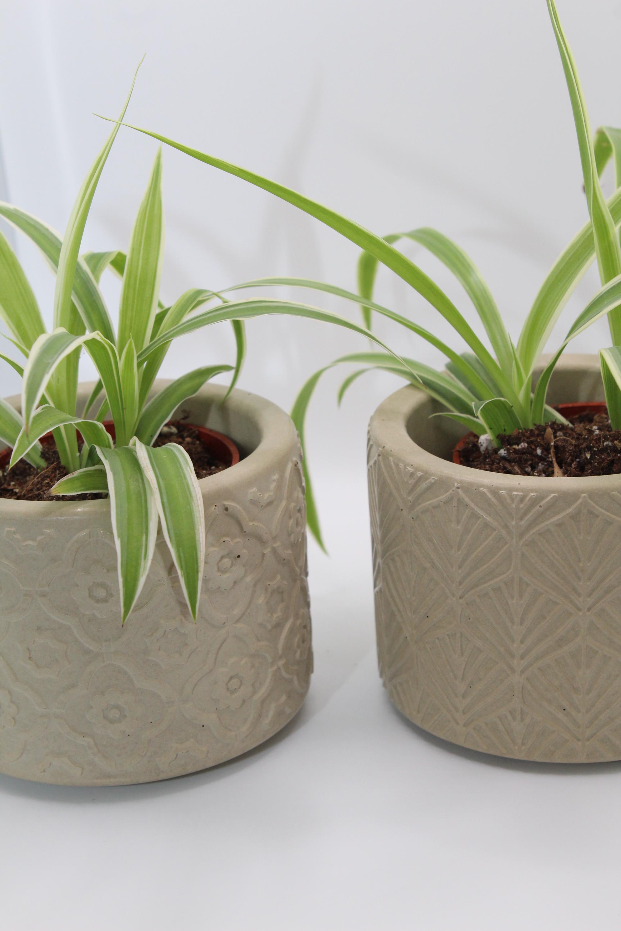 Elevate your plant display with this hand-poured concrete planter, thoughtfully designed to showcase your greenery while keeping a clean, modern look. Each piece features a hand-pressed botanical texture, adding subtle dimension and an organic feel to your space. Its soft, neutral tone blends effortlessly with any décor, making it the perfect home for your favorite small plants and a stylish accent for any shelf, windowsill, or tabletop.